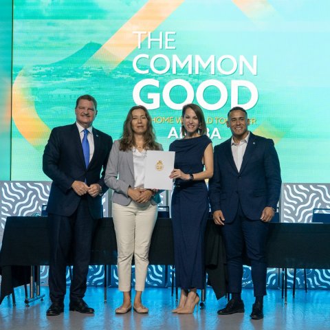 Durante e momento significativo di firmamento, como parti di e Common Good Conference, den presencia di Prome Mnister Mike Eman y Minister di Turismo Wendrick Cicilia, Natasha Silva di Aruba Conservation Foundation y Ronella Croes di Aruba Tourism Authority, a firma un Memorandum of Understanding (MoU) pa continua y fortifica e cooperacion den nos barionan.