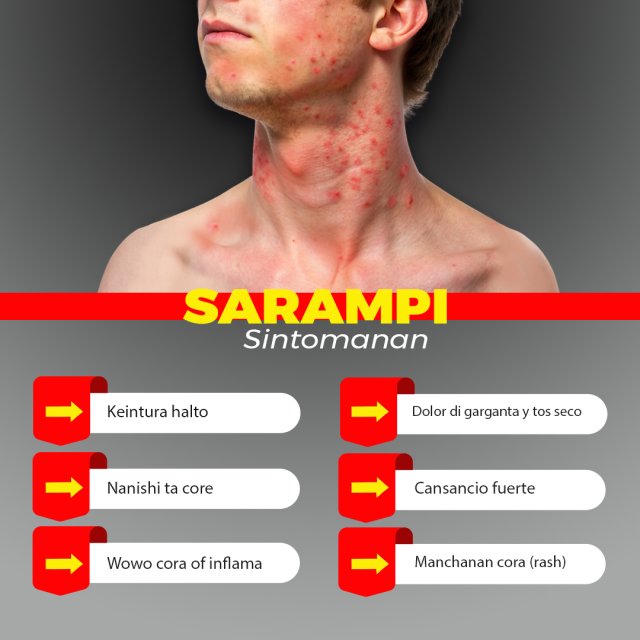 Resumiendo e scenario actual y teniendo na cuenta cu casonan di Sarampi ta sigui aumenta mundialmente y ta causando brote na diferente paisnan, DVG ta alerta comunidad completo, pero especialmente personanan cu ta traha den sector turistico, manera hotel, restaurant, aeropuerto y transporte publico, pa keda conciente di e sintomanan di Sarampi, proteha nan mes y tuma contacto cu nan dokter di cas si tin sospecho di Sarampi.