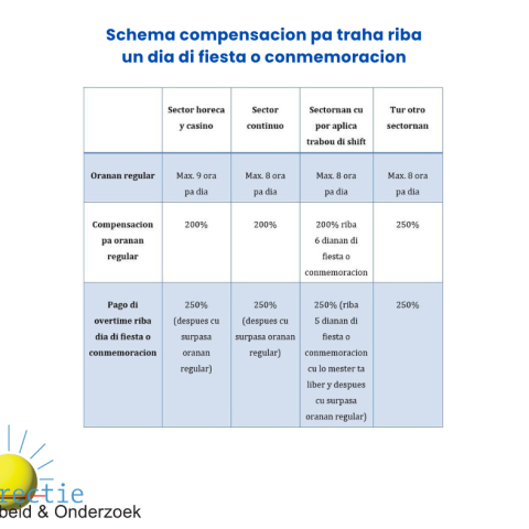 Pa sectornan horeca, casino y continuo (companianan cu ta traha 24/7- conoci como ‘traha warda’) un dia di fiesta o conmemoracion por ta un dia normal di trabou. Den caso cu e trahado ta riba schedule pa traha riba e dia aki e tin derecho riba 200% di su salario. Si riba e dia aki e trahado traha mas cu su oranan regular (pa sector horeca/casino esaki ta 9 ora y pa sector continuo ta 8 ora) ley ta considera cu e trahado ta traha overtime riba un dia di fiesta o conmemoracion y e tin derecho riba 250% pa e oranan extra.