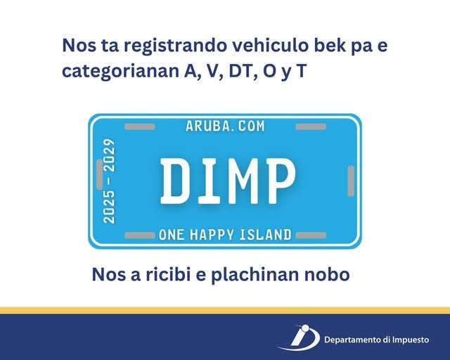 ORANJESTAD - Departamento di Impuesto(DIMP) ta informa cu nan a ricibi e plachinan nobo pa e categorianan A, V, DT, O y T y a cuminsa registra vehiculo bek pa e categorianan aki.