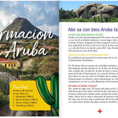 The children's book covers significant themes, including the formation of Aruba, its flora and fauna, history, population, industry, culture, tourism, and sustainability. It is a team production of the Aruba Excellence Foundation, consisting of Giovanni de Windt, Melissa Robert, Susana Romero, and Sharenda Clarinda. The colorful illustrations are by Yohandy Larmonie.