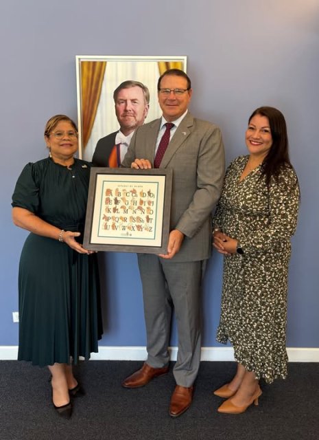 During the audience, they presented the Governor with a framed copy of the Aruban sign language alphabet.