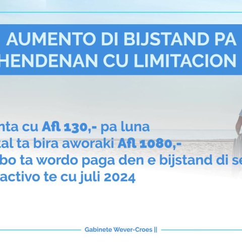 In the history of welfare benefits for people with disabilities, there have only been three increases, namely in 2004, 2007, and 2013. As of July 1, 2024, the welfare benefits for people with disabilities will increase by Awg. 130,00, bringing the total to 1080 florins per month. They will receive the Awg. 130,00 increase retroactively. Therefore, in addition to the 1080 florins in September, they will also receive the Awg. 130,00 increase for July and August 2024.