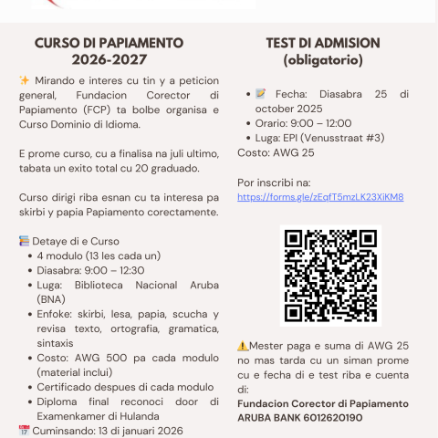 - Bank Details: Aruba Bank #6012620190, Fundacion Corector di Papiamento