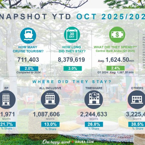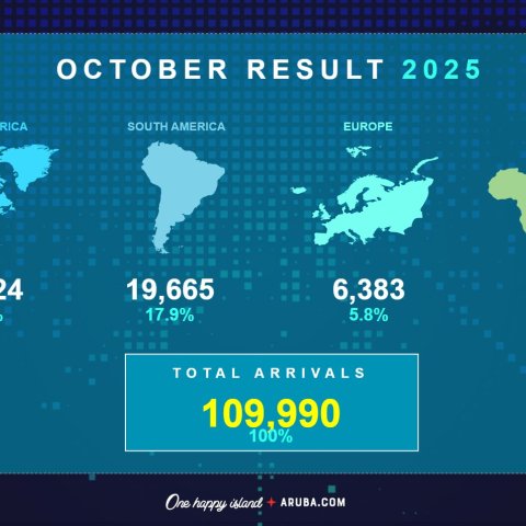 In oktober 2025 ontving Aruba in totaal 109.990 toeristen, een stijging van 5,7% ten opzichte van oktober 2024. Dit is een absolute stijging van 5.953 bezoekers. De meest opvallende stijging kwam uit Noord-Amerika met 80.224 bezoekers, gevolgd door Latijns-Amerika met 19.665, een stijging van 6,2% ten opzichte van 2024. Vanuit Europa ontving Aruba 6.383 bezoekers en uit andere regio's 3.718.