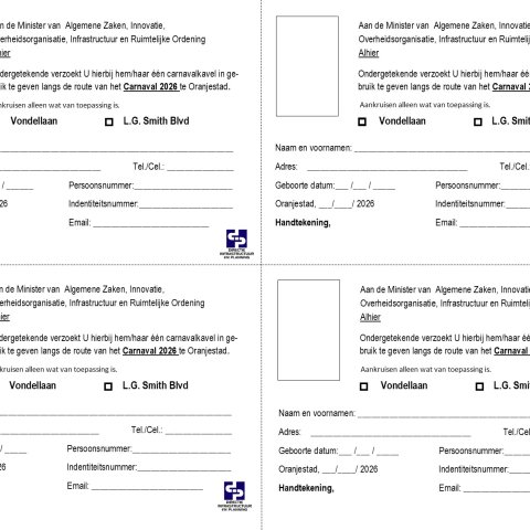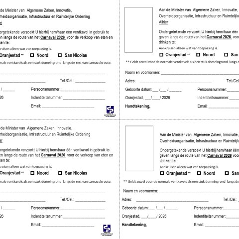 ORANJESTAD – De Directie Infrastructuur en Planning (DIP) informeert dat van maandag 5 januari tot en met donderdag 8 januari 2026 aanvraagformulieren voor Carnival-kavels beschikbaar zijn voor invulling en indiening.