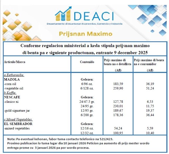 ORANJESTAD – Directie Economische Zaken maakt de maximumprijzen voor de komende periode bekend.