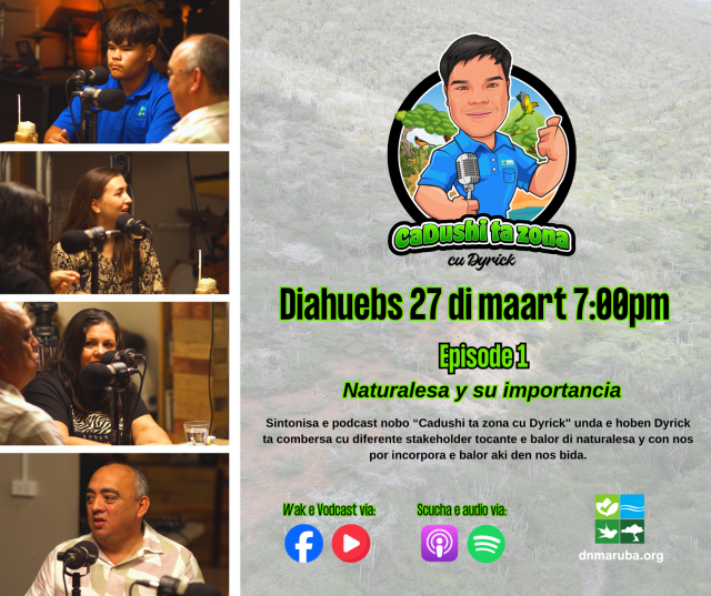 Vanavond, donderdag 27 maart 2025 om 19:00 uur, wordt de eerste aflevering "Natuur en haar belang" beschikbaar gesteld via de sociale mediakanalen van DNM, zoals Spotify, Apple Podcast, Facebook, Instagram en YouTube. De serie "Cadushi ta Zona cu Dyrick" wordt gepresenteerd door Dyrick Wouters, een jonge, nieuwsgierige en gepassioneerde liefhebber van Aruba's natuur en cultureel erfgoed.