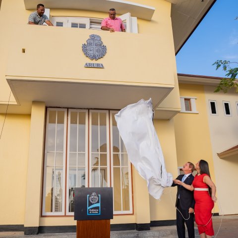 Onthulling van het Arubaanse wapen op het Bestuurskantoor