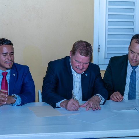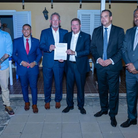 ORANJESTAD – Tijdens een receptie georganiseerd door de ambassadeurs op 9 oktober in Fort Zoutman, ondertekenden premier Mike Eman, minister van Financiën, Economische Zaken en Primaire Sector Geoffrey Wever, minister van Justitie, Integratie en Openbaar Vervoer Arthur Dowers en minister van Toerisme, Transport en Arbeid Wendrick Cicilia, samen met vertegenwoordigers van de Oranjestad Investors Group, de heer Elton Arends en de heer Harry Koeman, een Memorandum of Understanding (MoU) om samen te werken aan de uitgebreide verbetering van de hoofdstraat (Caya Grandi).