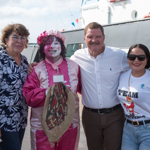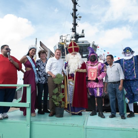 ORANJESTAD - Riba 16 di november 2025, hunto cu un multitud di mayor y mucha, Prome Minister mr. Mike Eman hunto cu Minister di Vivienda drs. Rene "Baba" Herdé, a duna Sinterklaas y su Pietnan un caluroso bonbini.